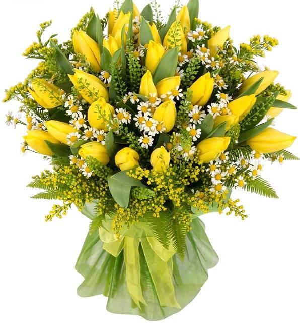 Букет из желтых тюльпанов и ромашек «Сочетание» - прекрасная смесь, несущая радость, яркость и положительные эмоции. Тюльпаны кричат об обворожительности улыбки, которая светит как солнце, а ромашки влекут за собой в поле своим непередаваемым запахом. Отличный букет, чтобы подарить заряд позитива членам семьи или близким сердцу друзьям.